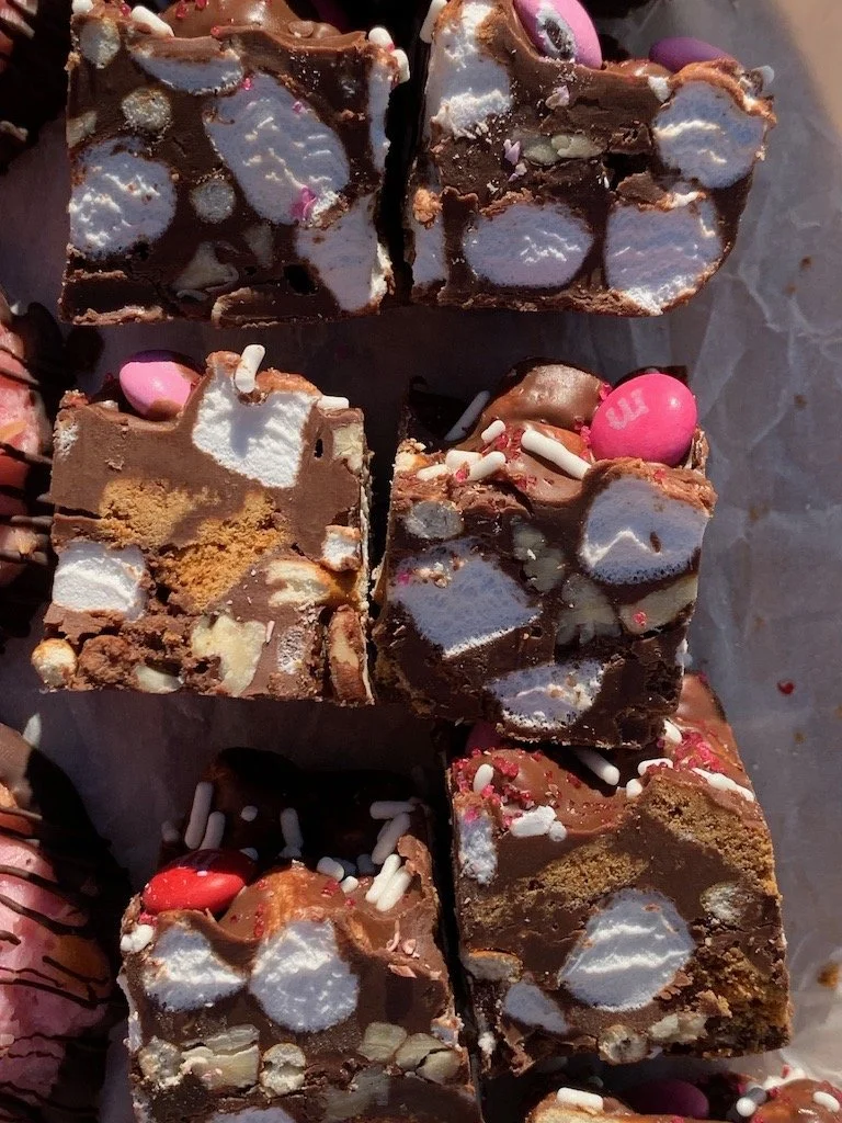 A fudgy peanut butter chocolate loaded with marshmallows, M&M’s, pecans, Biscoff cookies, pretzels and topped with sprinkles.