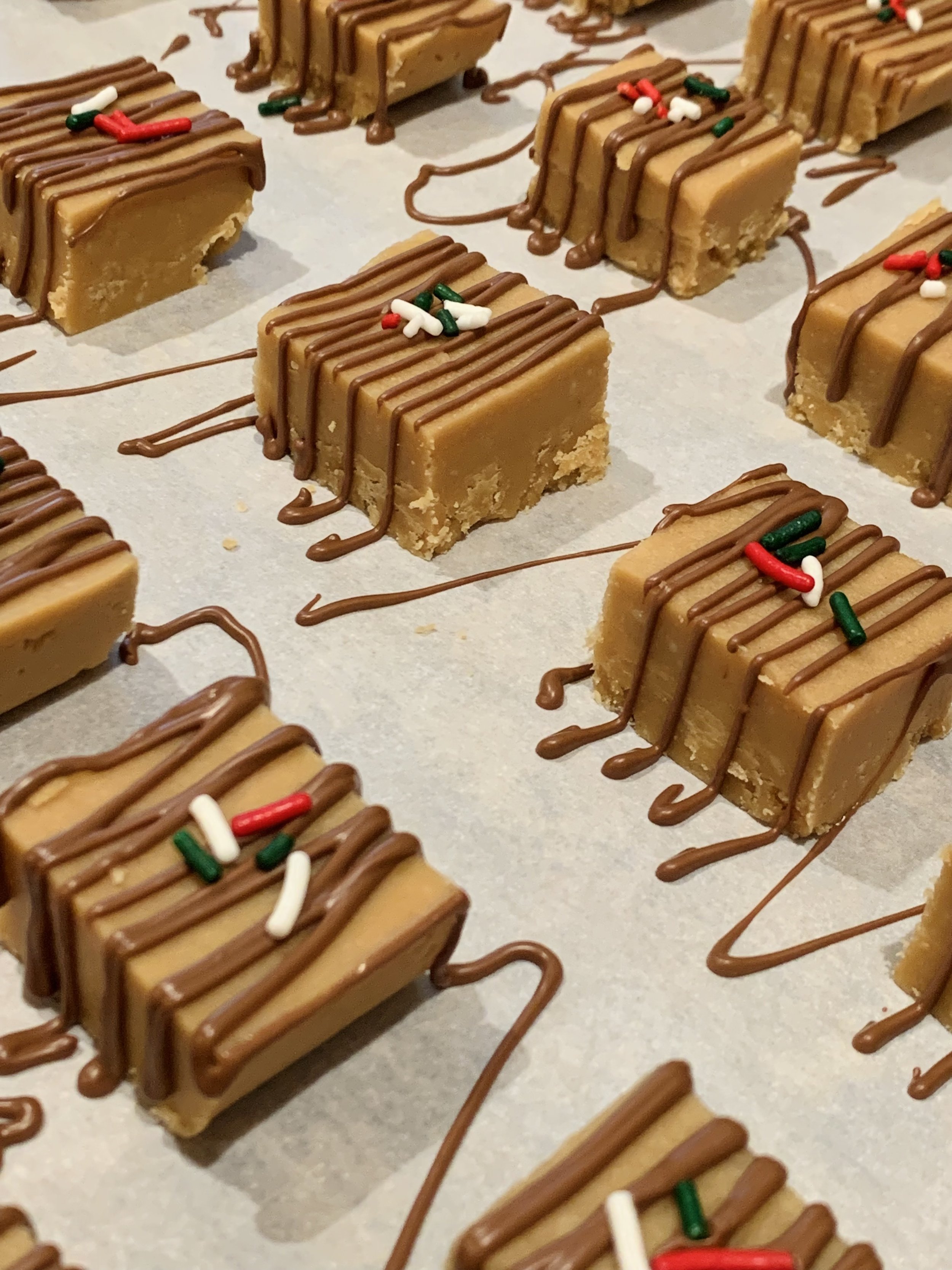 Rich and creamy peanut butter fudge topped with a milk chocolate drizzle and sprinkles.