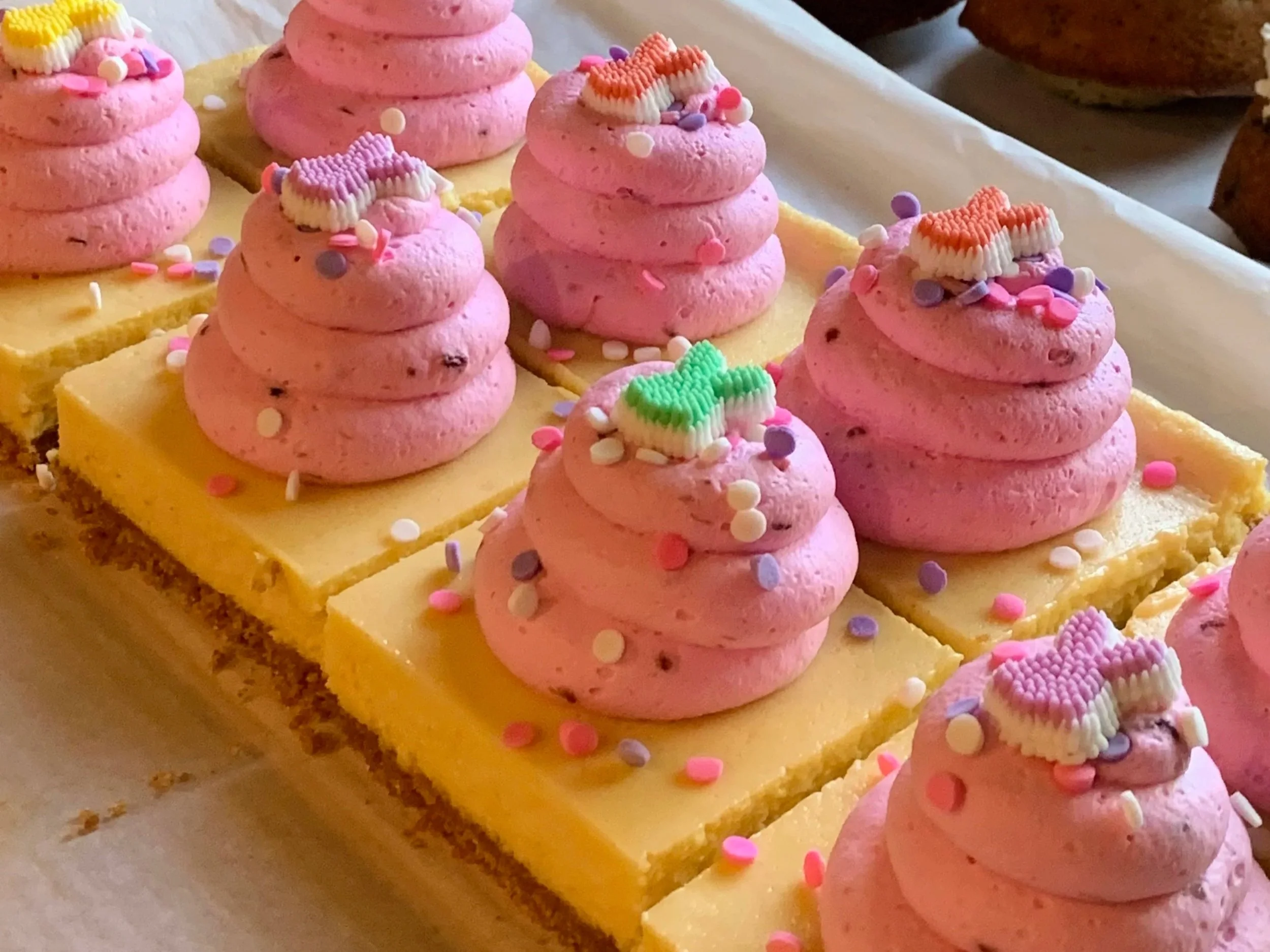 A creamy, customizable lemon bar topped with your choice of bluberry, vanilla bean, raspberry, or strawberry whipped cream, finished with colorful sprinkles. Perfect for birthdays, showers, or any celebration that calls for a bright, fun treat.