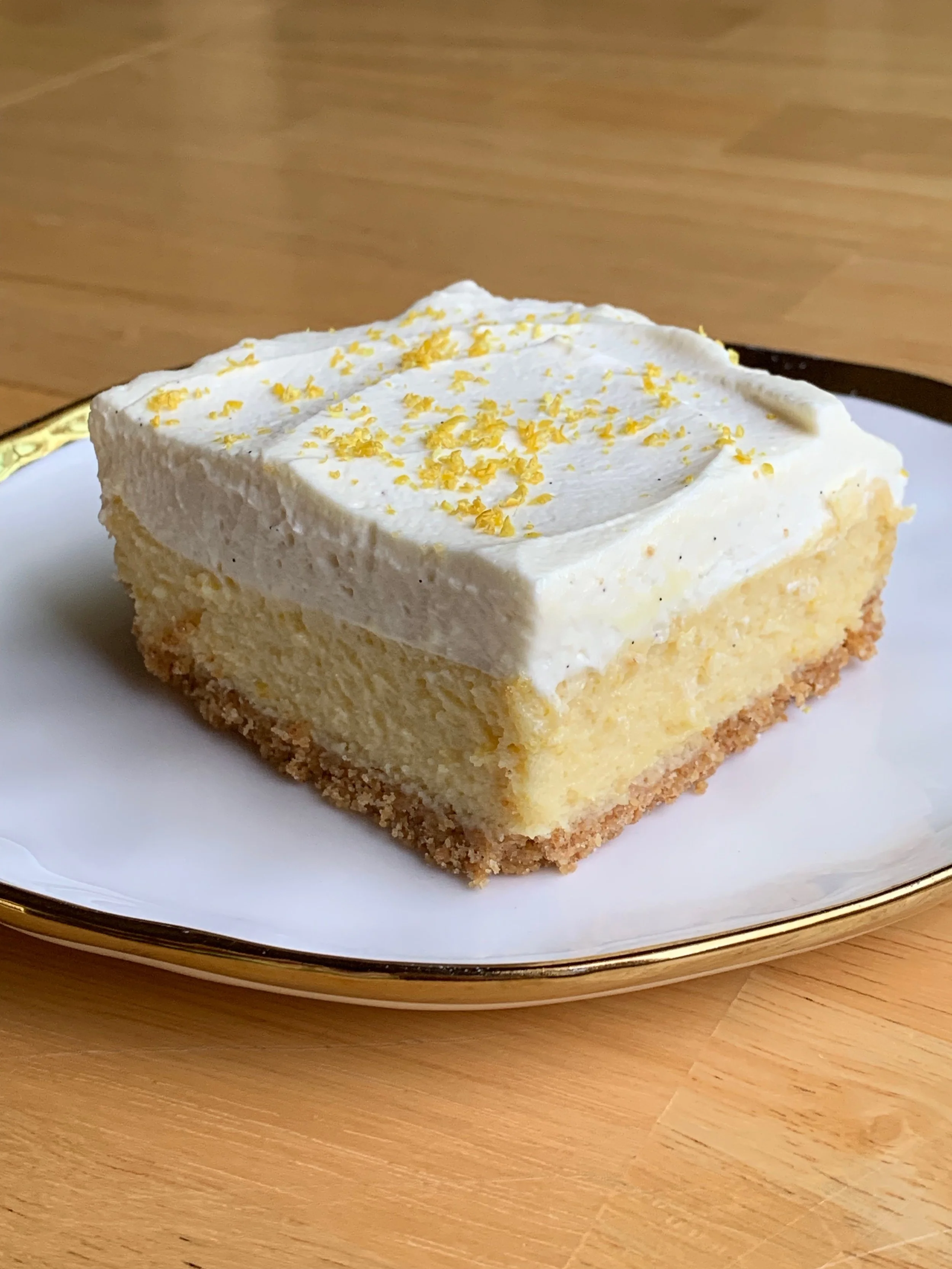 A buttery ginger graham cracker crust with a silky lemon filling made from fresh-squeezed lemon juice and zest, topped with a fluffy vanilla bean whipped cream and a sprinkle of fresh lemon zest.