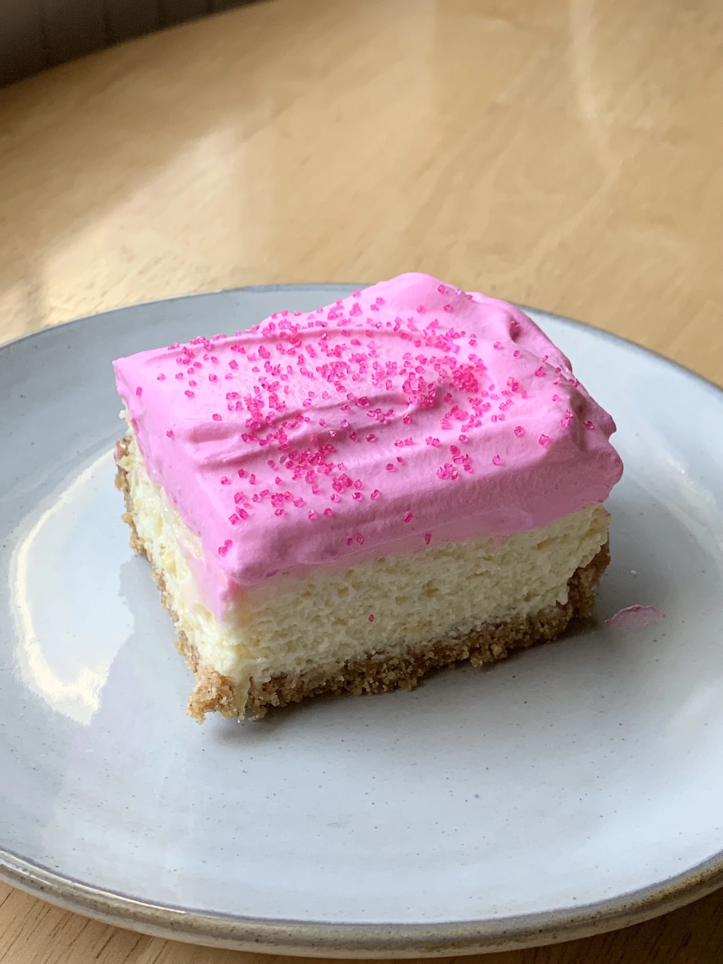 A buttery ginger graham cracker crust with a silky lemon filling made from fresh-squeezed lemon juice and zest, topped with a fluffy raspberry whipped cream and a sprinkle of pink sparkling sugar.